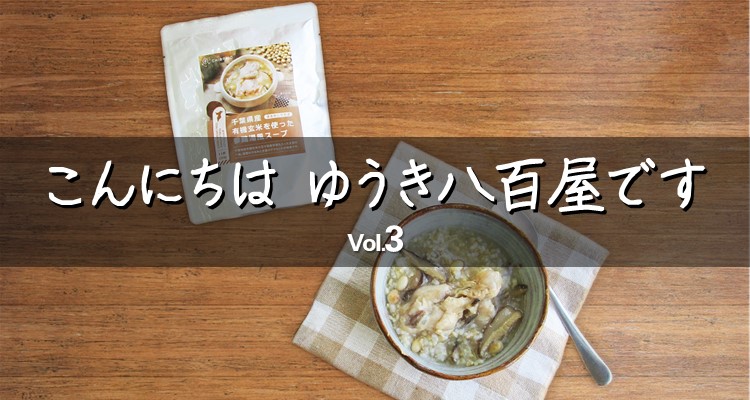 「こんにちは、ゆうき八百屋です Vol.3」では、千葉県産ローカル&オーガニックの地域ブランド「ちばびお-CHIBABIO」のレトルト加工食品「まるかじりちば」シリーズから、「有機玄米を使った参鶏湯風スープ」をご紹介。