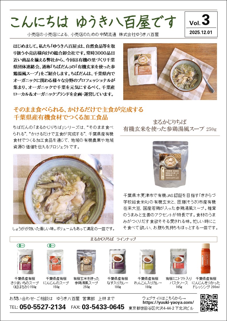 「こんにちは、ゆうき八百屋です Vol.3」では、千葉県産ローカル&オーガニックの地域ブランド「ちばびお-CHIBABIO」のレトルト加工食品「まるかじりちば」シリーズから、「有機玄米を使った参鶏湯風スープ」をご紹介。